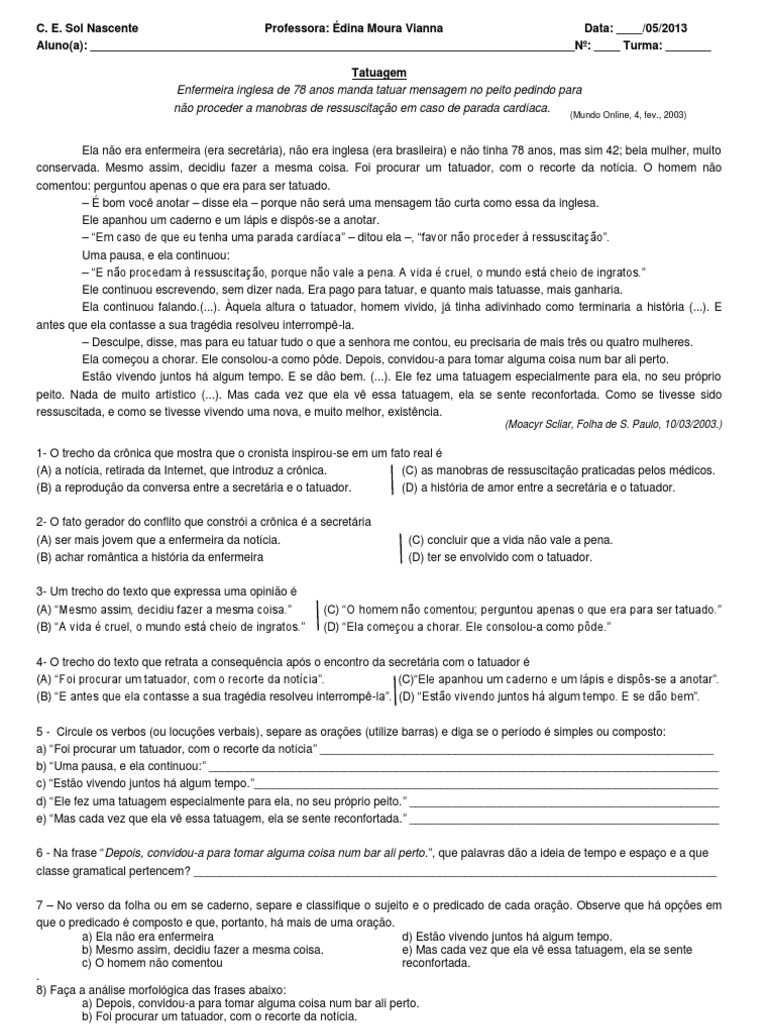 Ai gramática ai vida. Atividade sobre a crônica Histórias extraterrestres Moacyr Scliar Histórias extraterrestres Quando a mulher muito impressionada veio lhe falar sobre o óvni avistado no Mato Grosso do Sul ele mal pôde contar a satisfação. Atividade texto tatuagem moacyr scliar Mundo Online 4fev2003 Ela não era enfermeira era secretária não era inglesa era brasileira e não tinha 78 anos mas sim 42. Folha de São Paulo 15081995 Descritor. Atividade sobre o texto Cancelar é pouco de. 1- Retire do texto o fragmento que comprova que o cronista se inspirou em um fato real. Mesmo assim decidiu fazer a mesma coisa. E a menos que se trate de um pai desnaturado ou de um barbeiro cansado da profissão a emoção do pai será inevitável. Paulo 10032003 1- O trecho da crônica que mostra que o cronista inspirou-se em um fato real é A a notícia retirada da Internet que introduz a crônica. ATIVIDADE REFERENTE À SEMANA 4 Leia o texto a seguir de Moacyr Scliar atentando para sua pontuação e depois responda às questões de 1 a 8. Mas cada vez que ela vê essa tatuagem ela se sente reconfortada.
