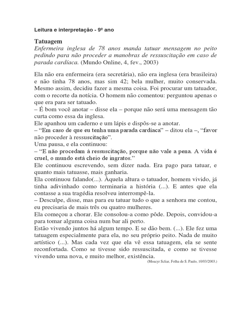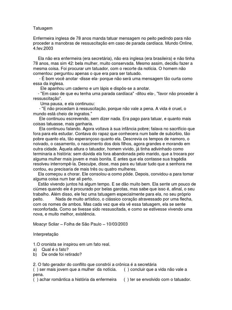 Como se tivesse sido ressuscitada e como se estivesse vivendo uma nova e muito melhor existência. Localize no texto um trecho que indica uma atividade rotineira que faz partedo nosso cotidiano2. Extrapolar idéias do texto. Identificar o narrador do texto a A história está sendo narrada. Atividade texto tatuagem moacyr scliar Não queria ser juiz. Enfermeira inglesa de 78 anos manda tatuar mensagem no peito pedindo para não proceder a manobras de ressuscitação em caso de parada cardíaca. Um dia seu filho se aproxima e diz assim como quem não quer nada. Foram procurar um lugar onde passar a noite. Pausa Moacyr Scliara Ativação de conhecimentos de mundo eRecuperação de contexto de produção do texto- Alguém já ouviu falar em Moacyr ScliarMoacyr Scliar - Moacyr Jaime Scliar nasceu a 23de março de 1937 em Porto Alegre RS. TEXTO 1 Amor e tatuagem Moacyr Scliar Epígrafe 5 10 15 Em tempos de relacionamentos fugazes uma aliança no dedo já não tem os efeitos de antigamente e a tatuagem surge como alternativa para selar definitivamente a união. Crônica Interpretação - Tatuagem - Moacyr Scliar Aqui o texto está completo elaborei algumas questões e usei uma de alternativa retirada de uma prova da prefeitura do Rio. Moacyr Scliar Folha de S. Atividade com interpretação de crônica para 8ºano - Moacyr Scliar A volta do filho pródigo.