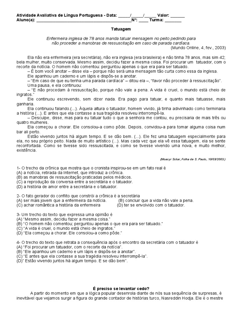 Atividade texto tatuagem moacyr scliar. Leia esta crônica de Moacyr Scliar para responder às atividades de 1 a 4. Hotel hospedaria qualquer coisa serviria desde que não fosse muito caro. Estavam cansados da viagem. Para casaMoacyr Scliar 6. Pai fiz a barba. Atividade sobre a crônica Rito de passagem de Moacyr Scliar Rito de passagem. O que nem sempre funciona. Como se tivesse sido ressuscitada e como se tivesse vivendo uma nova e muito melhor existência. Como se tivesse sido ressuscitada e como se tivesse vivendo uma nova e muito melhor existência. HÁ VAGAS casal chegou à cidade tarde da noite. Moacyr Scliar Folha de S. Paulo 10032003 4- O fato gerador do conflito que constrói a crônica é a secretária A ser mais jovem que a enfermeira da notícia.